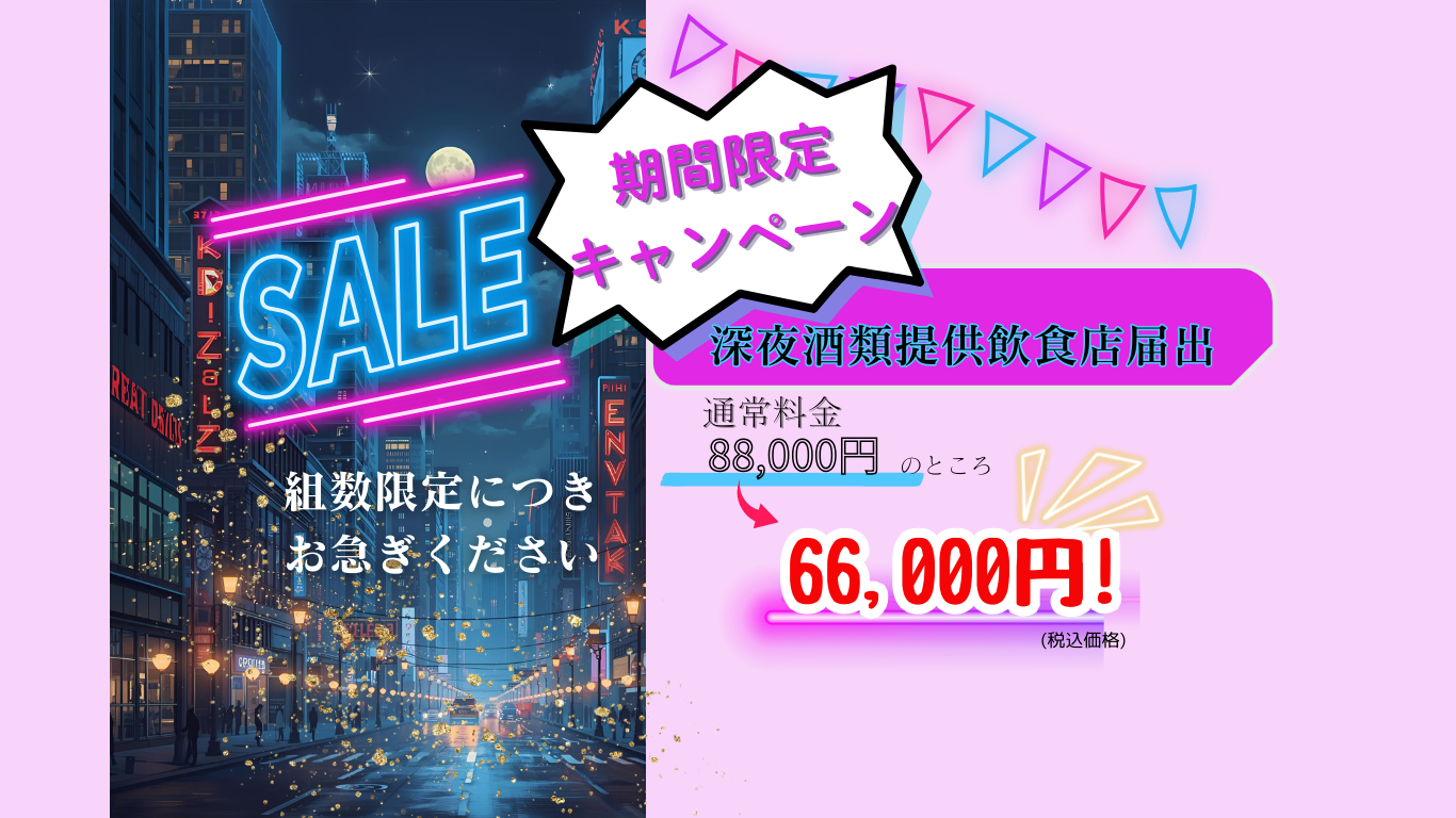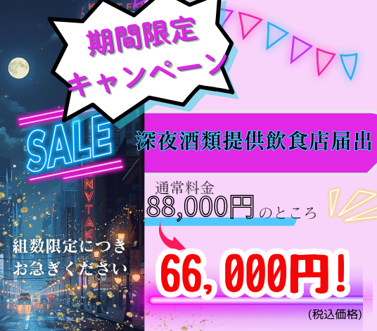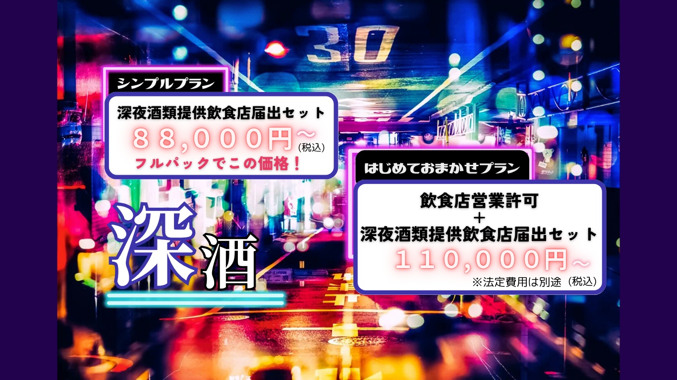 ・深酒+飲食店営業許可サポートは上記キャンペーン料金より+22,000円の88,000円(税込)でお受けします。